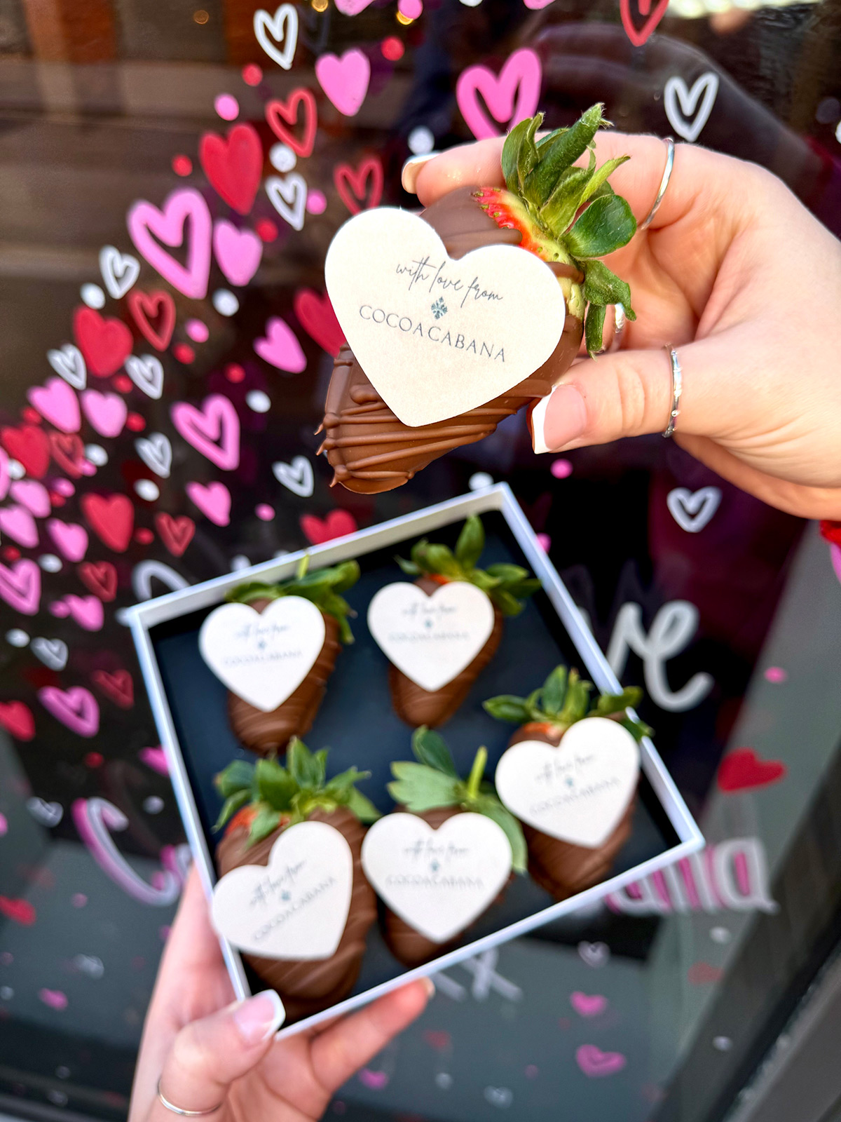 6 chocolate strawberries, hand-dipped in chocolate and decorated with an edible Cocoa Cabana wafer. Presented in a Cocoa Cabana gift box and ribbon.
